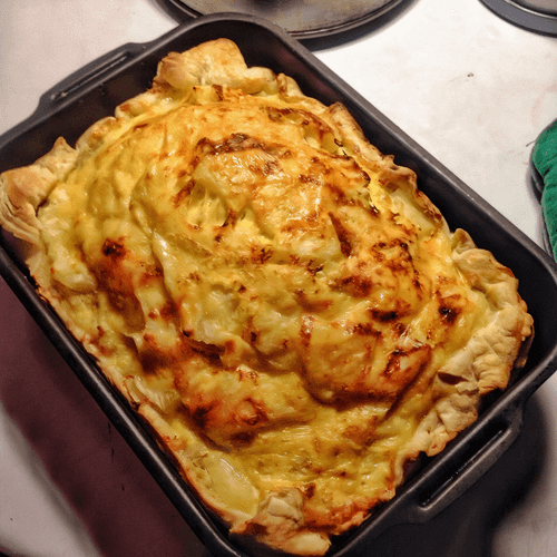 Рыбный пирог из слоеного теста с ананасами — неожиданное сочетание, которое удивляет своей гармонией вкусов. Нежное филе белой рыбы, пропитанное ароматом специй и жареного лука, соединяется с сочными кусочками ананаса, придающими блюду легкую сладковатую нотку. Залитый яичной смесью и покрытый расплавленным сыром, пирог приобретает аппетитную золотистую корочку. Исторически подобные блюда зародились в европейской кухне, где не боялись экспериментировать с контрастными вкусами. Этот пирог не только изысканный, но и универсальный — он подходит как для уютного семейного ужина, так и для праздничного стола. Его богатый вкус раскрывается лучше всего в сочетании с свежими овощами и легким белым вином, создавая незабываемый гастрономический опыт.