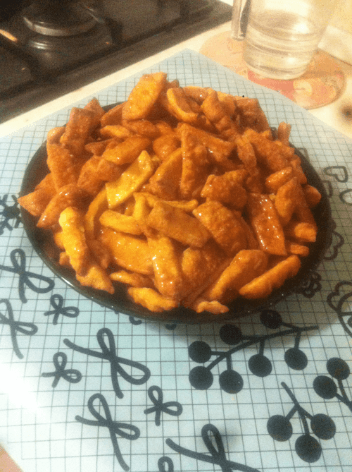 Полоски нарезать на кусочки длиной 2–3 см. Пожарить полоски в большом количестве масла до золотистого цвета (можно воспользоваться фритюрницей).
