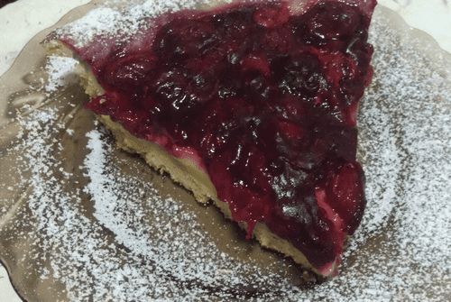 Слегка охлаждаем пирог и полностью, вместе с бортами, засыпаем сахарной пудрой. Т. к. начинка слегка влажная, она впитает пудру, но, учитывая кислинку, получается самое оно.