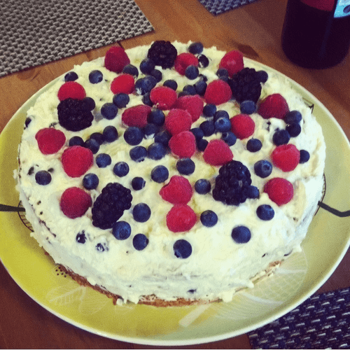 Достаем торт из холодильника. Снимаем края формы. Обмазываем торт со всех сторон сливками. Украшаем голубикой. По желанию можно так же украсить и другими ягодами.