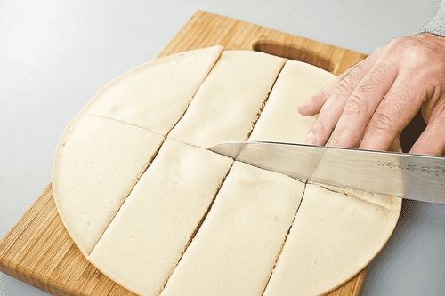 Вынуть форму из духовки, остудить и, аккуратно подцепляя при необходимости по бокам и снизу ножиком или лопаткой, переложить пласт застывшей массы на разделочную доску. Нарезать пастилу острым ножом на одинаковые прямоугольники.
