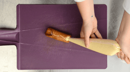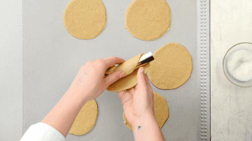 Разделить тесто на 4 части и каждую прокатать в паста-машине, пока толщина пластов не достигнет 1 мм. С помощью каттера диаметром 10 см нарезать кружочки теста и переложить на противень, покрытый бумагой для выпечки. Обернуть каждый кружочек вокруг металлических трубочек для канноли диаметром 2,5 см и длиной 10 см, закрепить сверху края и смазать взбитым белком (предварительно отделив белок от желтка).