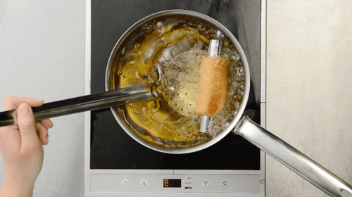 В шестилитровую кастрюлю налить растительное масло и разогреть до 180 градусов. Опустить несколько канноли в масло и обжаривать до появления яркого коричневого оттенка, одну-две минуты. Так же обжарить все остальные канноли, перекладывая на решетку. Вынуть трубочки из остывших канноли.