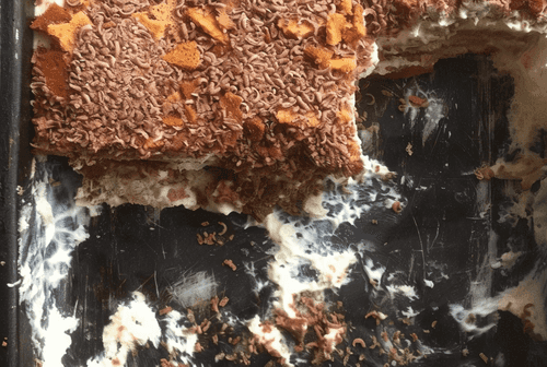 Последний слой должен быть крем, на него высыпьте какао.