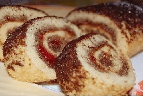 Снять с огня джем и достать из духовки корж. Снять бумагу и смазать одну сторону теплым джемом, завернуть в рулет и обильно посыпать сахарной пудрой.