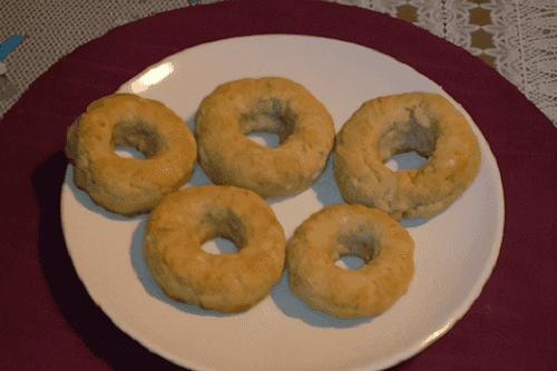 Из теста лепим шарики, в середине каждого шарика делаем отверстие и формируем бублики.