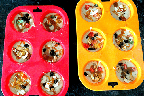 Вылить в формочки, засыпать цукатами и орехами (варианты начинки могут быть разные, как позволит ваша фантазия. Я хотела добавить сверху кокосовой стружки, но, к сожалению, она закончилась). Все полила тоненькой струйкой карамели.