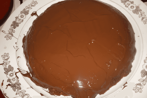 Шоколад поломать и расплавить (легче всего поставить чашку с кусками шоколада в остывающую духовку). Плоским ножом распределить шоколад по торту и дать застыть.