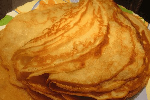 Ставим сковородку на 7 из 9, ждем пока она нагреется, затем снимаем ее с огня и черпачком наливаем на край тесто и, наклоняя сковородку, распределяем его по всей площади. Жарим блинчик с одной стороны около минуты, если вы боитесь обуглить ваш шедевр кулинарии, уменьшите огонь до 5 из 9, но тогда вам понадобится больше времени на его приготовление (обычно минуты достаточно, но все зависит от вашей сковородки, плиты и толщины получившихся изделий). Затем аккуратно переворачиваем блин на другую сторону и жарим его еще минуту. Готовый блин промажьте сверху сливочным маслом, он растопит необходимое количество, если просто провести им по всей площади блинчика.