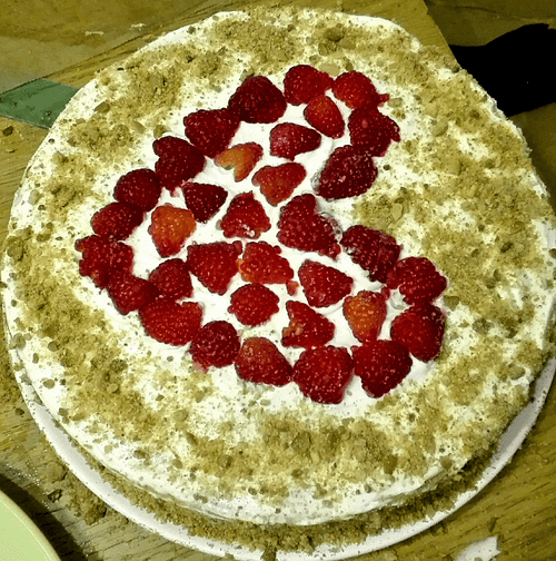 Для украшения можно использовать все, что вам угодно: шоколад, орехи, свежие ягоды, какао. Я украсила остатками коржиков и клубникой.