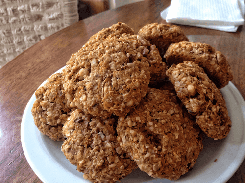 Приготовить две смеси в разных емкостях. Сухая смесь: 1 стакана ржаной муки, 0,5 чайные ложки соды, щепотка соли, 1 стакан овсяных хлопьев, 130 грамм слегка истолченных в ступке орехов кешью, морковь (натертой на мелкой терке). Все перемешать.