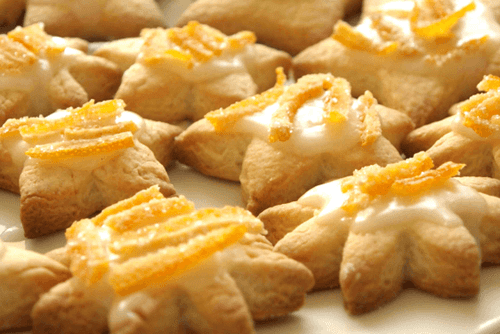 Сахарную пудру смешиваем с апельсиновым соком. Остывшее печенье покрываем глазурью. Сверху украшаем цукатами (любыми). У меня были апельсиновые.