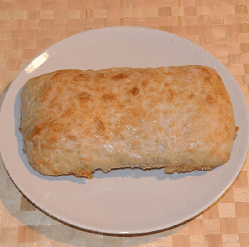 Загибаем сначала боковые края, затем край, где отступ был 3–4 см, сворачиваем тесто в рулет до места, где заканчивается начинка, поднимаем другой край и закрываем штрудель. Получается, что все края штруделя закрыты.