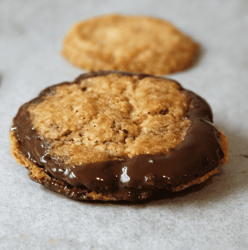 Обмакнуть одну сторону печенья и соединить с другим.