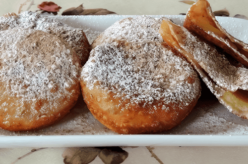 Стаканом (по диаметру чуть больше яблок) вырезать пирожки. Обжарить пирожки на растительном масле с двух сторон. Готовые выложить на бумажное полотенце, чтобы ушел лишний жир. Подавать можно и горячими, и холодными с сахарной пудрой.
