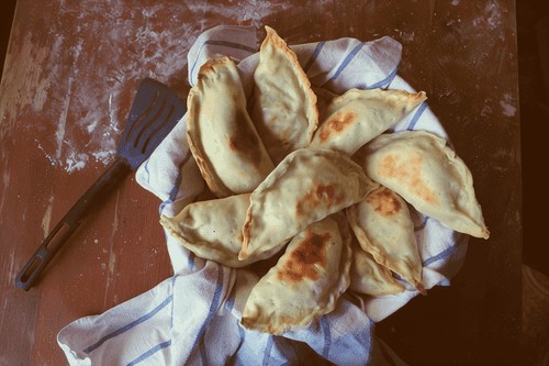 Из муки и воды замешиваем эластичное тесто, раскатываем, вырезаем кружочки тарелкой. Лучше, кстати, сначала раскатывать тесто потолще, а потом до раскатывать уже вырезанные кружки. На кружки кладем ложку начинки, защипываем края, кладем на застеленный фольгой противень пирожки. Каждый прокалываем несколько раз ножом (вилкой, к слову, неудобно) и смазываем яйцом.