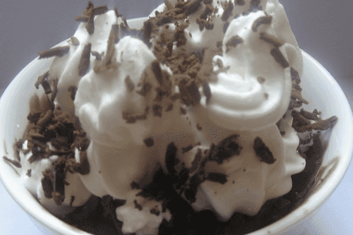 Поставить в холодильник на 2 часа. За это время десерт станет нежным и однородным. Десерт разделить на порции и посыпать тертым шоколадом.