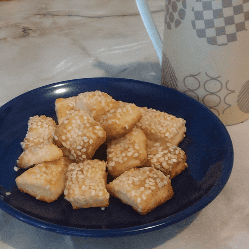 Раскатать тесто с пласт 0,5 см и посыпать кунжутом. Пройтись по тесту скалкой, немного вдавив кунжут. Нарезать тесто на квадратики по 2 см или использовать формочки.