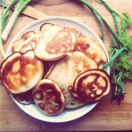 Сковорода должна быть с толстым дном. Разогреваем сковороду, в тесто добавляем 1 чайную ложку растительного масла, быстро перемешиваем и выкладываем небольшие оладьи в смазанную маслом горячую сковородку.