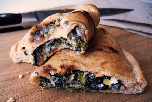 Тесто разделить на 4–5 частей. Раскатать на посыпанной мукой поверхностью. Выложить начинку, сложить пополам и защипнуть по краям.