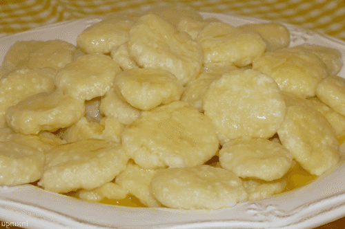 Готовые вареники выловим с кастрюли с помощью шумовки, выкладываем их на тарелку еще горячими и хорошенько смазываем их сливочным маслом, по желанию можете к вареничкам добавить немного сметаны.