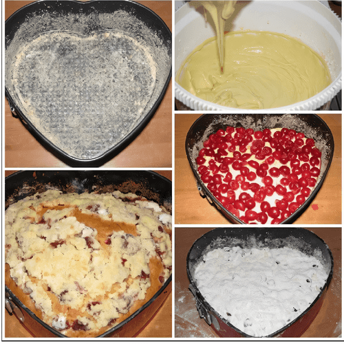 Выложить смесь в смазанную маслом и посыпанную мукой форму. На тесто положить очищенные от косточек черешни.