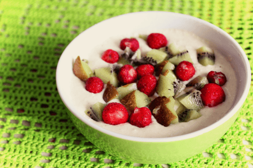 Сверху украсить сезонными ягодами и фруктами (кроме ягод отлично подойдут мягкие фрукты: персики, киви, ананас, для любителей орехи или мюсли).
