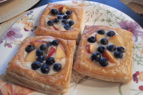 Из 8 листов готового бездрожжевого слоеного теста вырезаем квадраты. Получилось 16 квадратов.