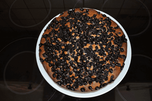 Смазываем растительным маслом форму и выкладываем тесто, сверху добавляем черную смородину.