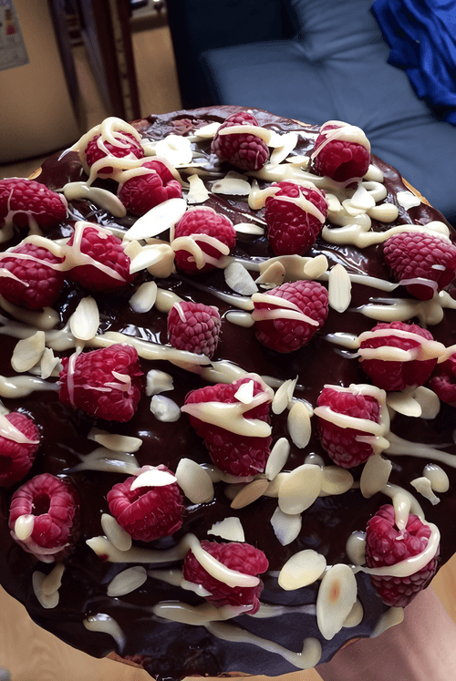 Выложила сверху малину и растопила на водяной бане белый шоколад, добавила немного масла, чтобы был жидким, из обычной соломинки полила мой бисквит сверху и добавила миндальные ломтики.