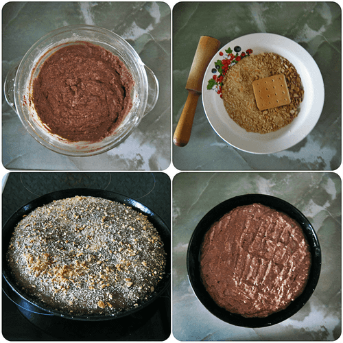 Перемешать полученную смесь с приготовленным печеньем и мукой. Тесто должно быть по консистенции напоминать овсяную кашу.