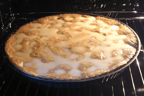 Ставим в духовку на 180 градусов, минут на 30–40. За 5 минут до готовности поливаем пирог заливкой.