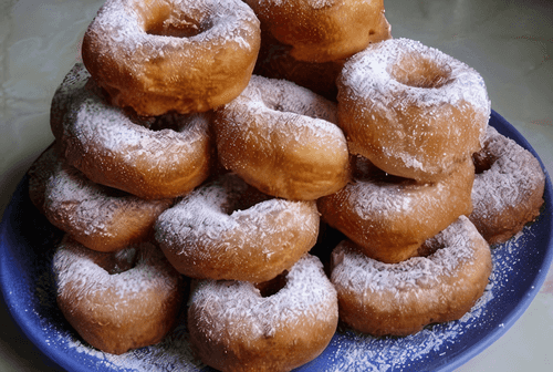 Потом жарю кружочки — они превращаются в шарики. Выкладываю готовые бублики на салфетку, чтобы впитать лишнее масло. По желаю можно посыпать сахарной пудрой.