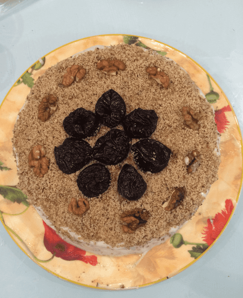 Когда смазали последний корж сверху, посыпать раздробленными орехами (присыпка)и украсить цельным черносливом и орехами.