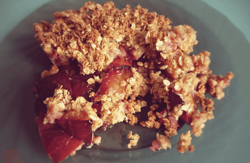 В форму выложить сливы и засыпать сверху овсяной крошкой. Выпекать в духовке при температуре 180 градусов 30–40 минут (должна получиться корочка).