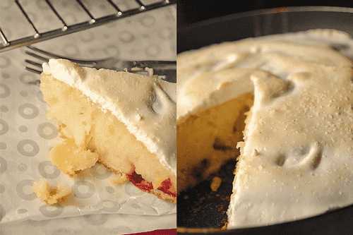 Собственно, пирог достаточно посыпать сахарной пудрой, положить сверху парочку ягод малины и это уже будет красиво, но можно пойти дальше — взбить один белок с 50 г сахара до устойчивых пиков, нанести меренгу на пирог и поставить под гриль на максимальную температуру буквально на 1–2 минуты. От духовки не отходить! Белок становится золотисто-коричневым моментально!