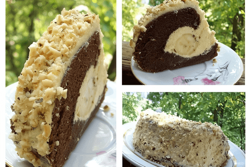 Вынуть скалку из бисквита, заполнить образовавшуюся нишу кремом, в центр положить очищенный банан. Украсить торт по желанию. У меня остатки крема и молотый фундук.