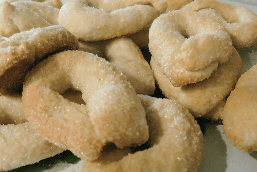 Обвалять получившиеся кусочки в сахаре и скрепить концы, чтобы получились овальные крендельки.