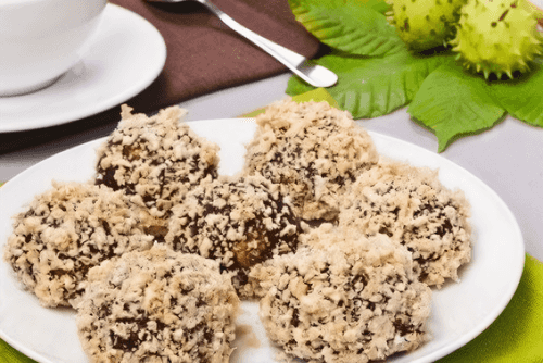 Остывшее тесто вынимаем из холодильника и катаем из него шарики по размеру как настоящие каштаны без зеленой кожицы.