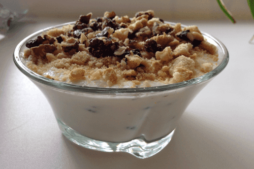Творожно-сметанный десерт с печеньем и орехами