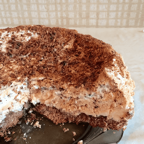 Собираем торт: бисквитный коржик хорошо промазать кремом. Затем положить корж безе и также хорошо промазать кремом во всех сторон. Сверху посыпать торт оставшейся от бисквита крошкой.