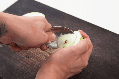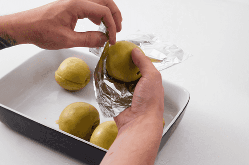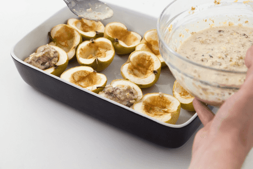 Наполнить получившейся смесью нижние половинки, закрыть их верхними половинками, обернуть каждое яблоко фольгой или поместить в кондитерские кольца подходящего размера — чтобы фрукты сохранили форму.
