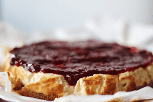 Вынуть чизкейк из холодильника, осторожно выложить из формы, распределить остывший соус сверху. Можно подавать сразу.