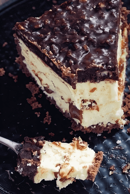На охлажденную основу вылейте половину молочного крема, затем выложите слой карамели. Сверху выложите остальной молочный крем. Поставьте форму в холодильник, чтобы начинка застыла. Затем нанесите шоколадно-ореховую глазурь и отправьте еще на 2–3 часа готовый торт в холодильник.