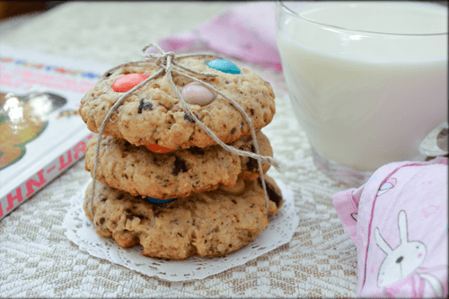 Всыпать сухие ингредиенты в жидкие и слегка помешать (тесто на этом этапе не должно быть однородным). Добавить M&M’s и порубленный на кусочки тёмный шоколад и вмешать их при помощи мягкой лопаточки (аккуратно, стараясь не повредить конфетки). При желании конфетки и шоколад можно не добавлять в само тесто, а украсить ими печенье только сверху.