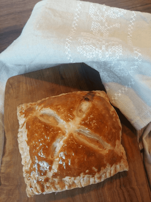 Выкладываем начинку на квадрат теста, сверху накрываем другим квадратом и зажимаем края. Я это делаю вилкой, получает крепко и узорно, также сверху сделать надрезы, чтобы пироги не взбухли шаром. Сверху просыпать тимьяном.