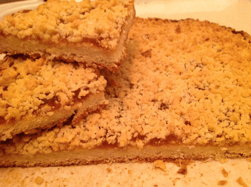 Треть теста, оставшегося в холодильнике, вынуть, натереть его на терке поверх начинки.