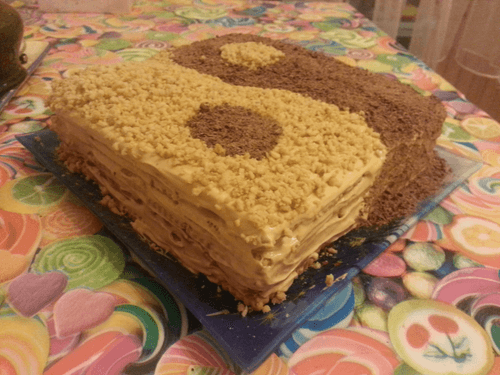 Достаем торт. Прикладываем трафарет. Половину торта посыпаем тертыми орехами, вторую половину шоколадом. Как на картинке.