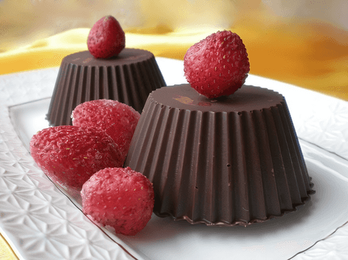 Теперь нужно снова растопить остатки шоколада, поскольку за это время он уже успел застыть в миске. И нанести кисточкой слой шоколада на «донышко». Через некоторое время аккуратно извлеките десерт из формочек. Я просто отогнула края и легко вытащила шоколадные корзинки.