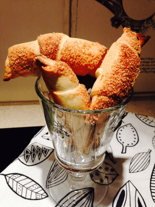 На плоскую тарелку высыпать сахар, добавить корицу по желанию, готовые рулетики опускать в сахар, слегка прижав, и выкладывать на покрытый пекарской бумагой или силиконовым ковриком противень сахарной стороной вверх.